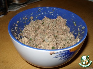 С консервов (у меня была сайра) сцедите масло. В емкости разомните рыбу, смешайте с петрушкой (у меня замороженная), луком и горчицей. Сюда же добавьте (по желанию) мелко натертый сыр. Я делала без сыра.