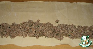 Раскатайте тесто (я купила готовое замороженное) в прямоугольник 50х20 см, толщиной примерно 0,3 см. Выложите начинку в виде полосы на один край. Другой край смажьте взбитым яйцом.