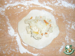 На каждый кружок выкладываем рис, защипываем края (как у беляшей, но только без отверстия). -