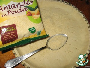 Выкладываем тесто в форму (у меня форма диаметром 24 см по дну), прокалываем, вилкой в нескольких местах, посыпаем миндальной мукой, чтоб тесто не размокло от начинки.