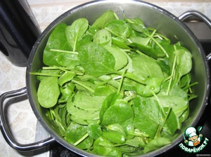 Шпинат вымыть сложить в кастрюлю, накрыть крышкой и варить без воды на сильном огне 3 мин. Снять с огня, дать остыть (свежемороженый шпинат достаточно просто разморозить). -