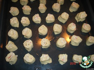 противень немного сбрызнуть водой и выложить "розочки" (чтобы они лежали начинкой на противне)