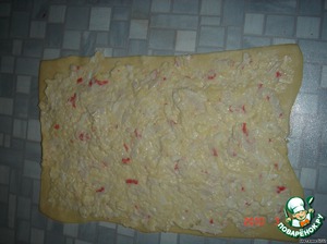 тесто раскатываем и пласт смазываем приготовленной смесью.
