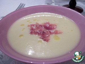 Разливаем по тарелкам, украшаем капельками ароматного оливкового масла и стружками вяленого мяса.