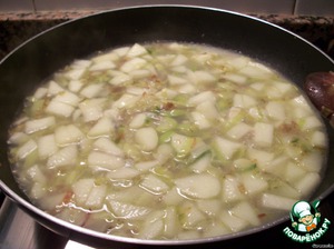 Можно использовать простую воду, но я предпочла бульон, чтобы немного заглушить ярко-выраженный яблочный вкус и подчеркнуть луковый. Поверьте, так получится вкусней. -