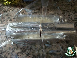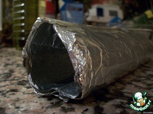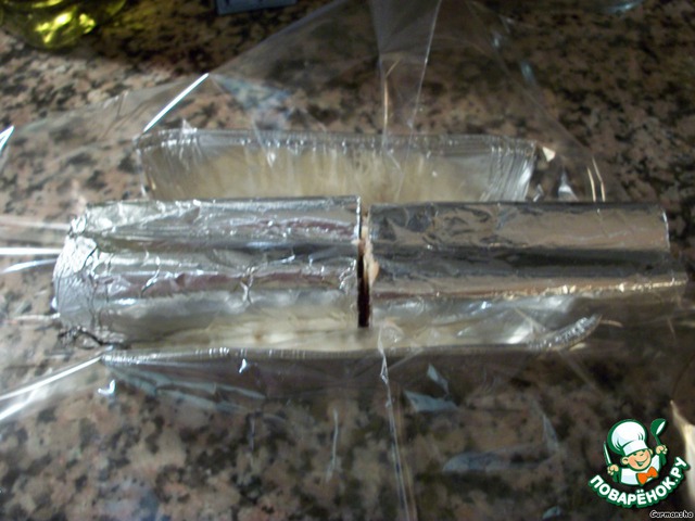 Обмажем маслом внутри, склеем скотчем разрез и обернем опять фольгой снаружи.