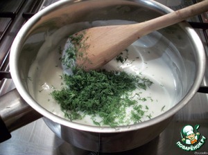 Непосредственно перед подачей готовим соус Бешамель, даем остыть несколько минут, вбиваем туда сметану и резаный укроп. Солим, перчим по вкусу. -