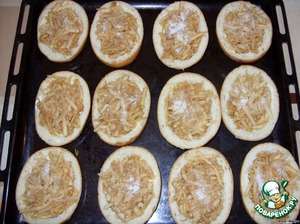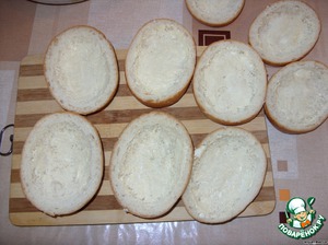 Булочки разрезаем пополам, вынимаем мякиш и смазываем тонким слоем сливочного масла
