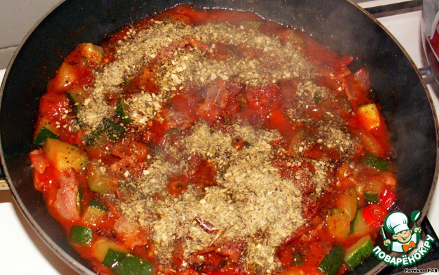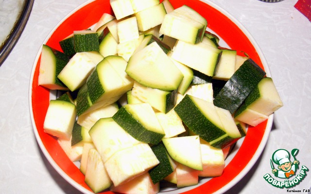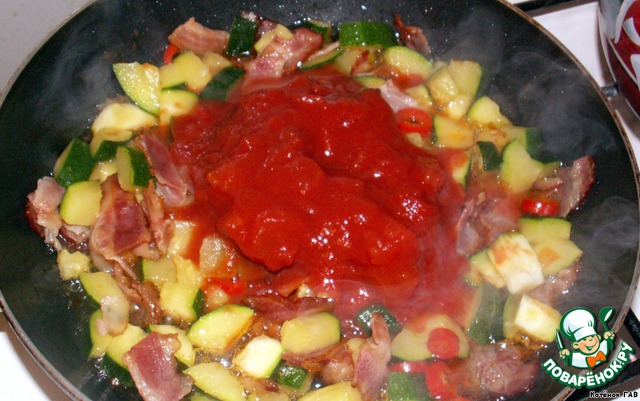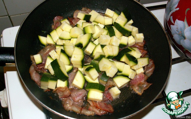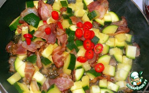 Выкладываем чили к цуккини и бекону, я положила много, получилось очень острое!!