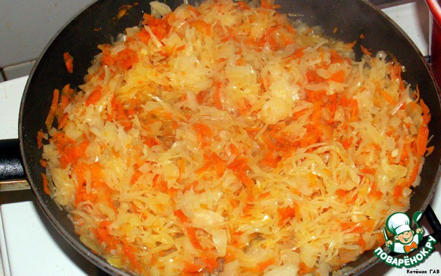 Режем лук мелко, трём на тёрке морковку. Квашенную капусту порезать, если она длинная. Обжариваем лук и морковь, далее капуста, немного бульончика, тушим овощи, чтобы капустка была мягкая.