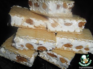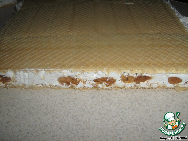Ставим нугу под пресс (чтобы вафельные листы хорошо приклеились) и оставляем на ночь. У меня нуга стояла на балконе. Думаю, что после остывания ее можно убрать в холодильник.
