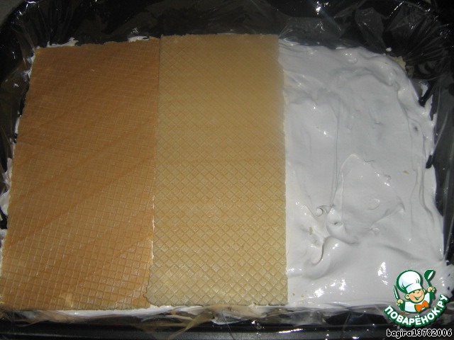 Пока миксер взбивает, приготовим форму для нуги: в прямоугольную форму (не больше 24x34, иначе нуга будет слишком "плоской") сначала положим пищевую пленку, а затем облатки или вафельные коржи. Я думаю, что для этой цели можно использовать и разъемную круглую форму.