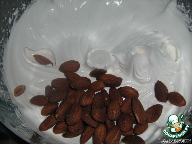Теперь добавляем теплый миндаль (теплый, потому, что если добавить холодный, нуга будет быстро застывать) и аккуратно перемешиваем массу.