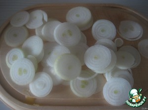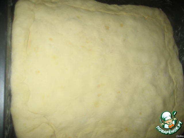 Тесто разделить на две части. Из одной половинки раскатать пласт и выложить его на смазанный маслом противень. На тесто равномерно разложить начинку. Посолить и поперчить.
