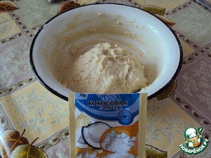 • Смешать муку, порубленный маргарин, развести 3 ст.л. сахара в тёплом молоке, влить, всыпать соду, кокосовую стружку, всё тщательно перемешать.