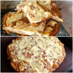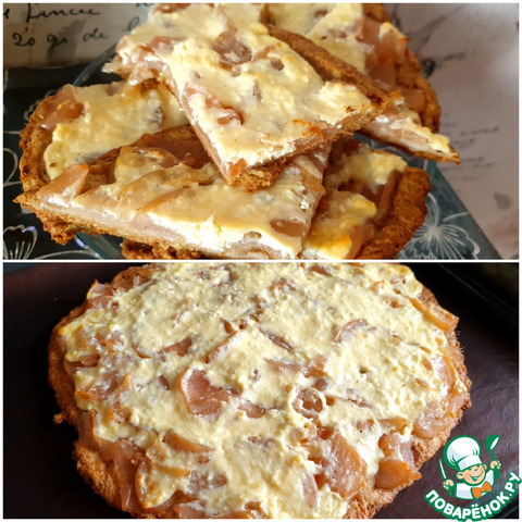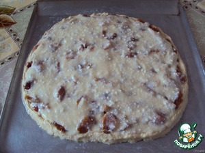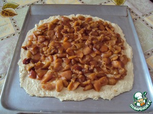 • Тесто размять руками на смазанном противне, сверху выложить яблоки (без сиропа).
