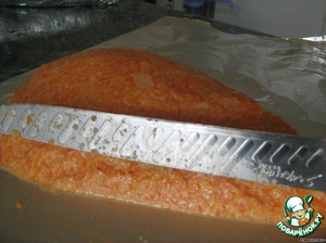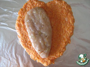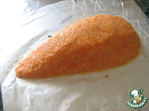 6. Морковную массу выкладываем в форме сердца на фольгу высотой 1 см. Начинку из фарша формируем в котлетку и выкладываем ближе к центру морковного пласта и сворачиваем с двух сторон. Закрываем начинку, соединяем края. -