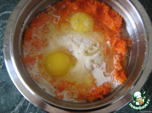 4. Варёную морковь натираем на мелкой терке, добавляем манку, сливки, 2 яйца, 2 ст. ложки оливкового масла, соль. Перемешиваем, чтобы получилась кашица.