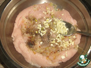 3. Смешиваем филе курицы с поджаренным луком, чесноком, солью и черным перцем. Вымешиваем фарш. -