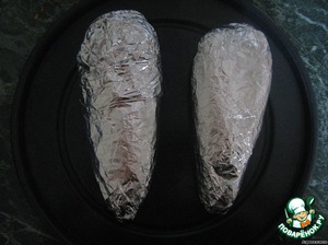 8. Заворачиваем в фольгу. Делать это нужно очень аккуратно. И закрыть все края, чтобы не вытекал сок. Запекаем в духовке 40-50 минут, при температуре 220 градусов.