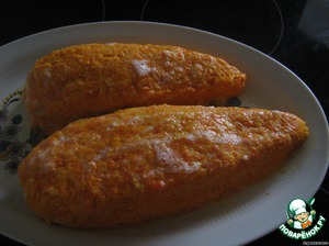 9. После запекания рулетов, снимаем фольгу, перекладываем на антипригарное блюдо. Если морковный пласт отделился от филе курочки - залатайте дырочки способом, который я описывала выше, тупой стороной ножа. У меня были большие проблемы - морковный пласт прилепился к фольге и пришлось его отдирать и опять донаращивать наши морковки. (Надо Гоше доработать рецепт). В завершение необходимо смазать рулетки взбитым белком. И опять в духовку на 10-15 минут, также при 220 градусов.