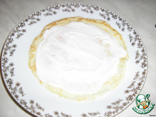 Выкладываем блин на тарелку, смазываем мягким творогом (у меня была творожная "Aктивиа"), можно заменить творожной массой.
