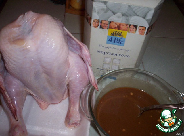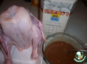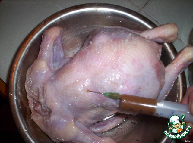 Курочку промоем, опалим остатки оперения и натрем снаружи и изнутри морской солью. Соусом я сделала подкожные и внутримышечные инъекции. Это делает нашу птичку очень сочной и визуально она становится очень солидной, на глазах увеличивается в размерах.;) Маленький, но очень ценный совет - почаще промывайте иглу, она быстро засоряется мукой!