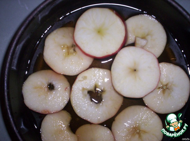 Выложить яблоки нарезанные кружочками.