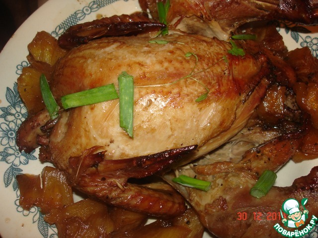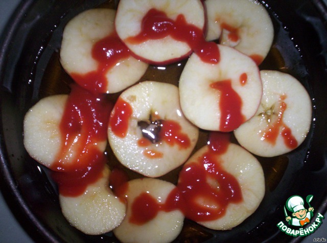 Полить яблоки томатной пастой. Положить на яблоки курочку и поставить в духовку на час.