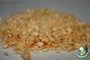 В это время измельчаем 50г орехов (50 ядер) для обсыпки. Не мелко, но и не крупно. Средне.