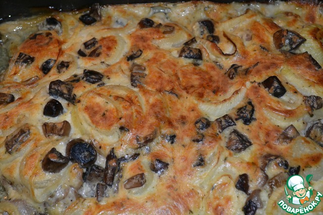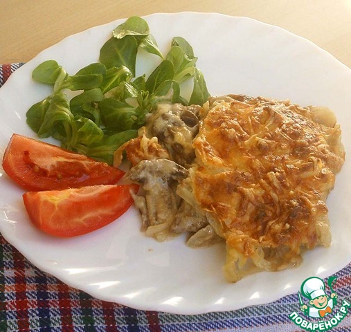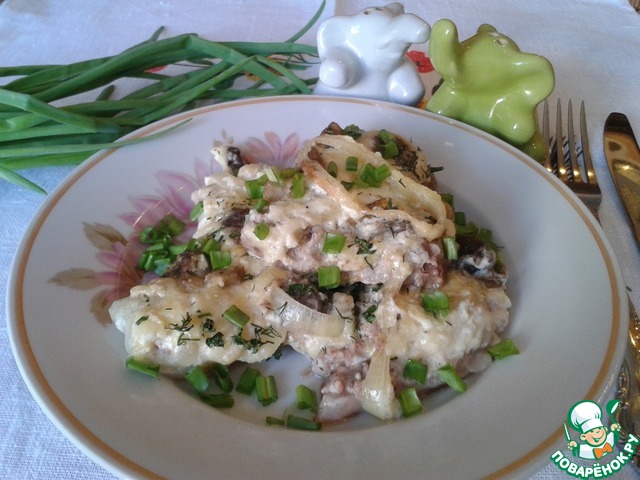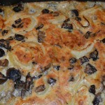 Выкладываем в противень мясо, лук и грибы, предварительно их размораживать нет необходимости. У меня слегка оттаяли, пока лежали и ждали своей очереди.