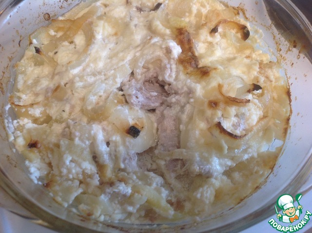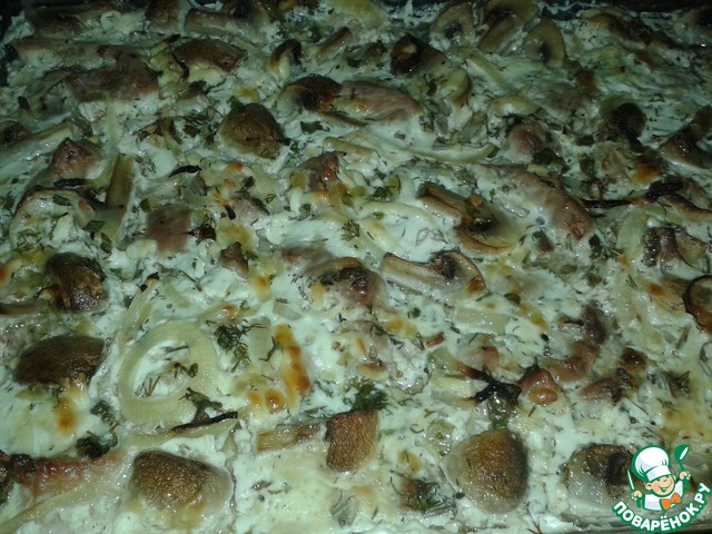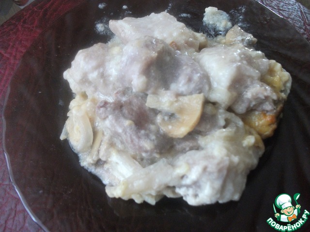 Заливаем мясо с грибами заливкой.