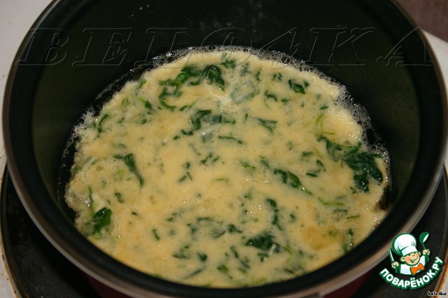 Корж шпинатный. В мисочке смешиваем 1 яйцо, 1ч. л. молока, 1ч. л. тёртого сыра, 1ч. л. муки и размороженный комочек шпината. Взбиваем. (Вместо шпината можно взять любую зелень, как свежую, так и замороженную)