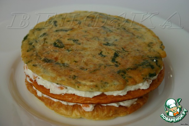 Накрываем красивым коржом. (В моём варианте внизу оказался яичный корж, в середине томатный, на самом верху - шпинатный)