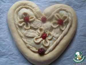 Я побаивалась, что серединка пирога не пропечется - все таки стык"сердца" был толстоват, да и листочки сверху присутствовали, но все обошлось - сырого участка не было.
