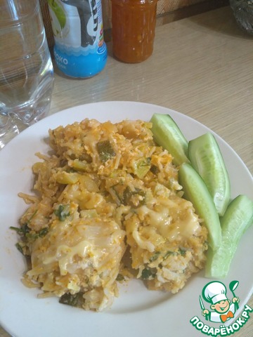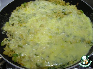 ) и столовую ложку томат. пасты, добавляем немного воды и тушим минут пять, не забываем посолить по вкусу. Пока все тушится, взбиваем яйца, солим, перчим, добавляем порубленную зелень и молоко, затем кладем к цуккини макароны, перемешиваем. Потушили пару минут, затем добавляем ко всему яичную смесь, тушим минуту, посыпаем сыром и под гриль в духовку, чтобы сыр расплавился, достаем и кушаем.