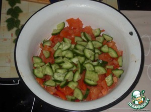 У помидоров удалить семена и сок и нарезать кубиками.