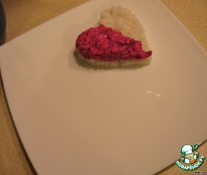 вареный рис, измельченный сладкий красный перец и свекольно-сырно-смет анную массу -
