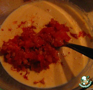 50 грамм измельченного на мелкой терке сыра смешиваем с яйцом, сметаной, мукой, солью, перцем и мускатным орехом