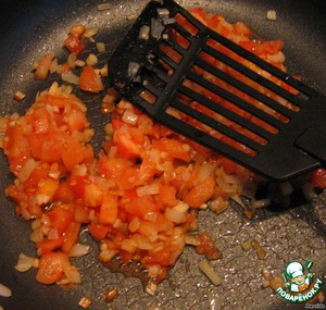 Очищаем помидор от шкурки и нарезаем мелкими кубиками, добавляем в сковородку, слегка обжариваем (около минуты)