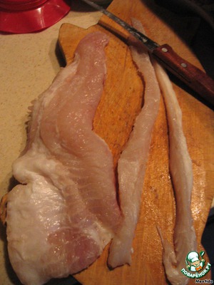 Рыбное филе хорошенько моем, просушиваем бумажными полотенчиками или салфетками, нарезаем полосочками