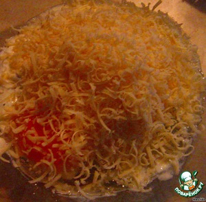 Затем выкладываем нашу сметанно-креветочную массу, отправляем в разогретую до 200С духовку минут на 25, после чего посыпаем оставшимся тертым сыром (50 грамм) и снова возвращаем в духовку, чтобы сыр зарумянился