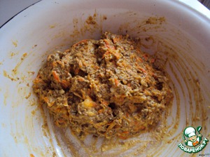 Печень натереть на тёрке, добавить яйца, остывшую морковку (немного оставьте для украшения), порезанный сыр, муку.