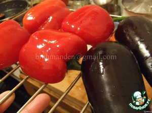 Укладываем перцы и баклажаны разрезом вниз на решетку.