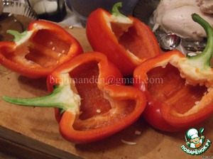 Перец разрезаем пополам вместе с плодоножкой. Удаляем семена.