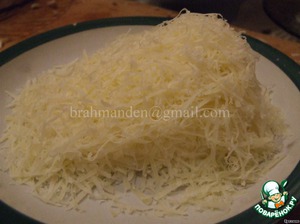 Содержимое сковородки перекладываем в другую емкость, остужаем полностью и смешиваем с тертым пармезаном.