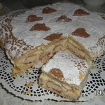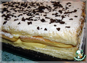 На мой взгляд, лучше выпекать сразу 2 "коржа", т.е. сложить по 2 слоя теста 20х25 см (а не 4 слоя вместе) - так удобнее, ничего не придется разрезать потом.