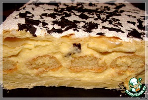 Потом остается только засыпать торт сахарной пудрой и шоколадной стружкой (или украсить по своему желанию).
