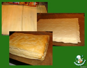У меня было 2 рулона слоеного теста размером 40х25 см, разрезала их пополам, получилось 4 пласта 25х20 см.
