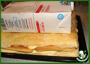 1/2 часть крема выкладываем на нижнюю половину слоеного "коржа",